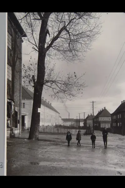 Husfasader langs Tore Hunds vei (tidl. Fridtjovs vei). Barn vendt mot fotografen. Fra Lille Tøyen haveby (hageby). Plassen ble kalt for Neshjørnet etter kjøpmann Næss Bygningen inneholdt Kolonial fiskebutikk og broderiforretning. Tobakk/godteributikk var det på enden av huset. Mellom treet og fasaden på bygget til høyre ser vi inngangen til melkebutikken som ble drevet av Marmong. I bakgrunnen røyken fra pipa til destruksjonsanlegget som lå langs Økernveien. Sannsynligvis fra 1920-tallet. Albumtittel: "Fotografier over Kristiania kommunes boligbebyggelse".