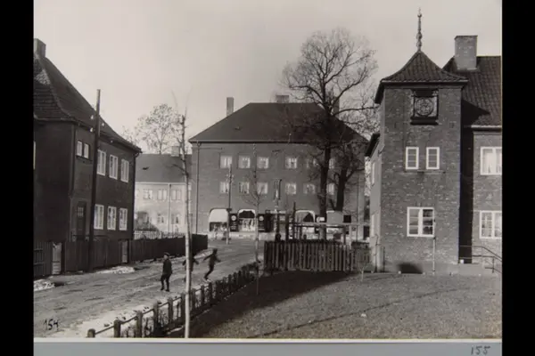 Kaare Røddes plass mot butikk- og kontorbygget i Tore Hunds vei (tidl. Fridtjovs vei) 43-45. Barn i lek. Fra Lille Tøyen haveby (hageby). Sannsynligvis fra 1920-tallet. Albumtittel: "Fotografier over Kristiania kommunes boligbebyggelse".