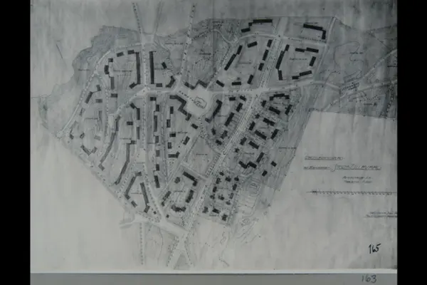 Plan / Tegning (fra 1918) av eiendommen Store Ullevål vedr. Ullevål Hagebyutbyggingen, laget av "Boligtilsynets Arkitektkontor". Kvartalsvis inndeling. Sannsynligvis fra 1920-tallet. Albumtittel: "Fotografier over Kristiania kommunes boligbebyggelse".