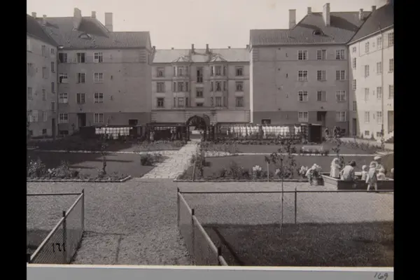 Husfasader mot indre gårdsrom i Jessenløkken Boligselskap i kvartalet Kirkeveien, Schwachs gate, Jacob Aalls gate og Suhms gate. Barn i lek. Portal / buegang ut mot Suhms gate. Sannsynligvis fra 1920-tallet. Albumtittel: "Fotografier over Kristiania kommunes boligbebyggelse".