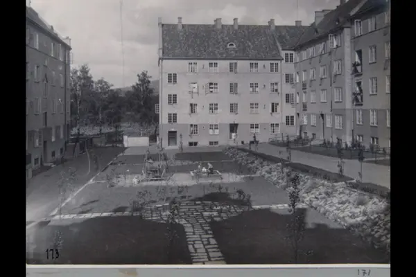 Husfasader mot indre gårdsrom i Jessenløkken Boligselskap i kvartalet Kirkeveien, Schwachs gate, Jacob Aalls gate og Jonas Reins gate. Barn i lek. Åpning mot Kirkeveien. Sannsynligvis fra 1920-tallet. Albumtittel: "Fotografier over Kristiania kommunes boligbebyggelse".