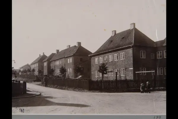 Husfasader mot Ansgar Sørlies vei (tidl.Tømmermannsgata) ved krysset mot Kaare Røddes plass. Fra Lille Tøyen haveby (hageby). Sannsynligvis fra 1920-tallet. Albumtittel: "Fotografier over Kristiania kommunes boligbebyggelse".
