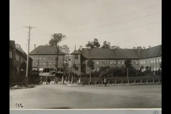Ansgar Sørlies vei foran. Husfasader mot Kaare Røddes plass. Butikkbygningen (Økernveien 43-45) med fasaden mot Tore Hunds vei (tidl. Fridtjofs vei) i bakgrunnen. Fra Lille Tøyen haveby (hageby). Sannsynligvis fra 1920-tallet. Albumtittel: "Fotografier over Kristiania kommunes boligbebyggelse".
