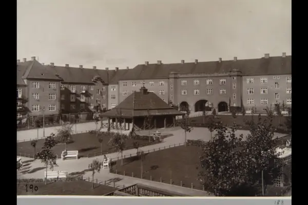 Mastrups gate med gateportal (buegang). Husfasader mot indre gårdsrom. Parkbenker. Grusganger. Trafobygg. Fra kvartal VIII i Torshovkvartalene (Torshovbyen). Sannsynligvis fra 1920-tallet. Albumtittel: "Fotografier over Kristiania kommunes boligbebyggelse".