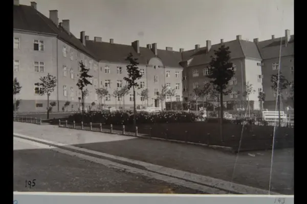 Husfasader mot indre gårdsplass i kvartal VII i Torshovkvartalene (Torshovbyen). Parkbenker. Mastrups gate i forgrunnen. Sannsynligvis fra 1920-tallet. Albumtittel: "Fotografier over Kristiania kommunes boligbebyggelse".