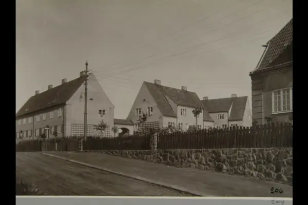 Bebyggelse på Ullevål Hageby, fra krysset Vestgrensa Eventyrveien. Sannsynligvis fra 1920-tallet. Albumtittel: "Fotografier over Kristiania kommunes boligbebyggelse".