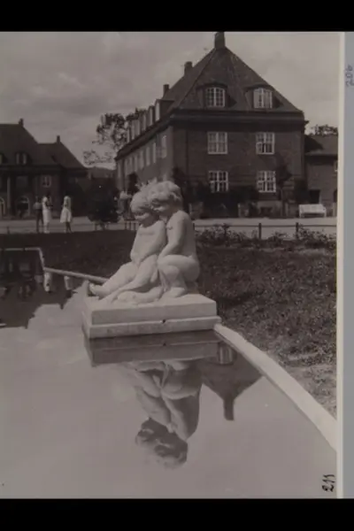 Damplassen på Ullevål Hageby. Barneskulpturer av Gustav Wolff (fra 1922) ved vanndammen. Sannsynligvis fra 1920-tallet. Albumtittel: "Fotografier over Kristiania kommunes boligbebyggelse".