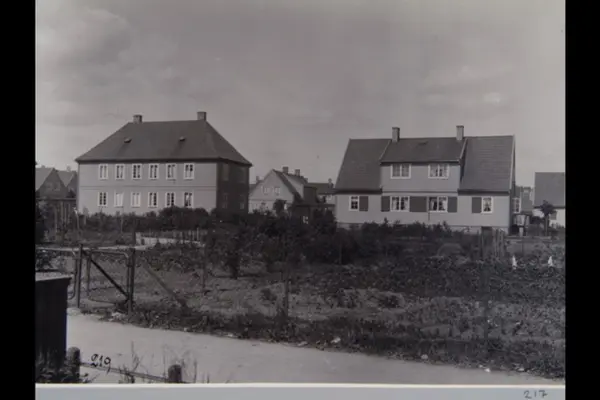 Bebyggelse i Jutulveien, sett fra Spångbergveien. Hager med bærbusker. Tåsenløkkenprosjektet. Sannsynligvis fra 1920-tallet. Albumtittel: "Fotografier over Kristiania kommunes boligbebyggelse".