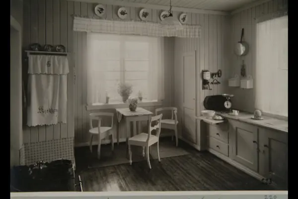 Kjøkken med kaffekvern på veggen, kjøkkenvekt, vedkomfyr og spisekrok. Sannsynlig i bolig på Ullevål Hageby. Sannsynligvis fra 1920-tallet. Albumtittel: "Fotografier over Kristiania kommunes boligbebyggelse".