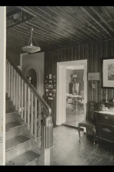 Hall med trappeoppgang. Dør inn til stue. Møbler i rokokko-stil. Sannsynlig i bolig på Ullevål Hageby. Sannsynligvis fra 1920-tallet. Albumtittel: "Fotografier over Kristiania kommunes boligbebyggelse".