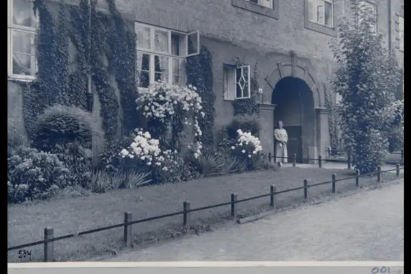 Husfasade og inngangsportal mot Agathe Grøndahls gate. Villvin og blomsterbed. Fra Torshov-kvartalene (Torshovbyen). Sannsynligvis fra 1920-tallet. Albumtittel: "Fotografier over Kristiania kommunes boligbebyggelse II".