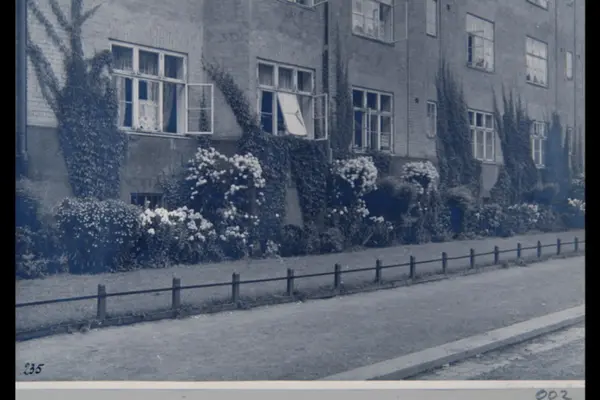 Husfasade mot Krebs gate. Villvin og blomsterbed. Fra Torshov-kvartalene (Torshovbyen). Sannsynligvis fra 1920-tallet. Albumtittel: "Fotografier over Kristiania kommunes boligbebyggelse II".
