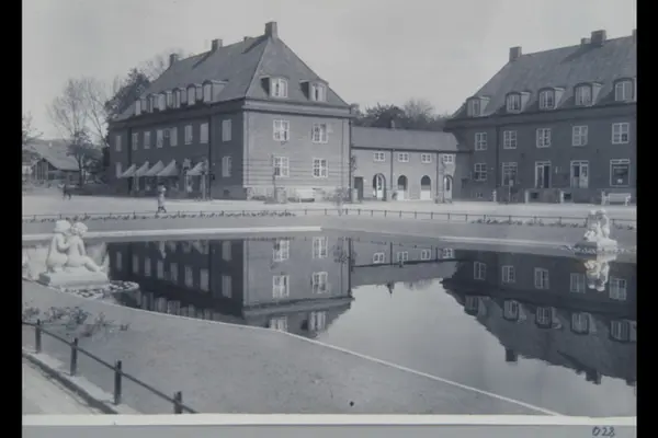 Damplassen på Ullevål Hageby med dam, barneskulpturer, postkontor og butikker. Sannsynligvis fra 1920-tallet. Albumtittel: "Fotografier over Kristiania kommunes boligbebyggelse II".