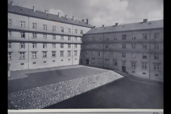 Husfasader mot indre gårdsplass i kvartalet Waldemar Thranes gate, Ungers gate, Bjerregårds gate og Bergstien. Leiegård i funkisstil. Sannsynligvis fra 1920-tallet. Albumtittel: "Fotografier over Kristiania kommunes boligbebyggelse II".