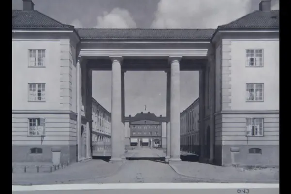 Søyleport til Knud Graahs gate mot Brettevilles gate. Hans Nielsen Hauges gate 34 og 36 i forgrunnen. Fra Nordre Åsen-kvartalene. Sannsynligvis fra 1920-tallet. Albumtittel: "Fotografier over Kristiania kommunes boligbebyggelse II".