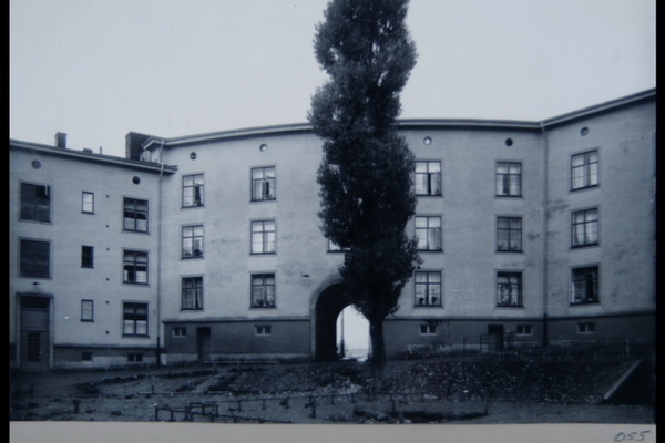 Husfasader og portal / buegang mot indre gårdsplass i kvartal I ved Hans Nielsen Hauges plass. Gårds-tre. Fra Søndre Åsen-kvartalene. Sannsynligvis fra 1920-tallet. Albumtittel: "Fotografier over Kristiania kommunes boligbebyggelse II".