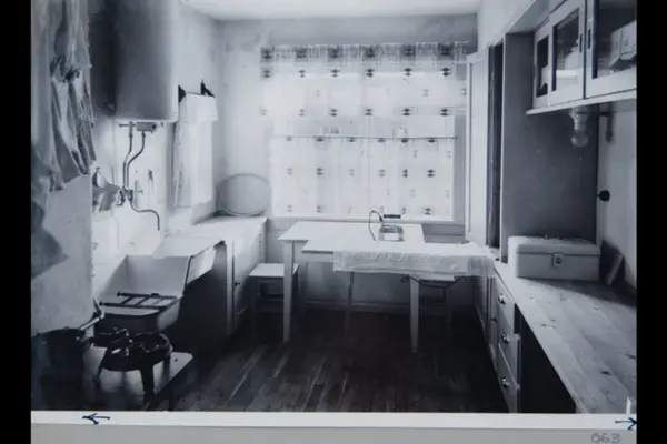Kjøkken med varmtvannsbereder og strykejern i bolig i Sandakerveien 83-95. (A/S Sandakerveien Byggeselskap.) Sannsynligvis fra 1920-tallet. Albumtittel: "Fotografier over Kristiania kommunes boligbebyggelse II".