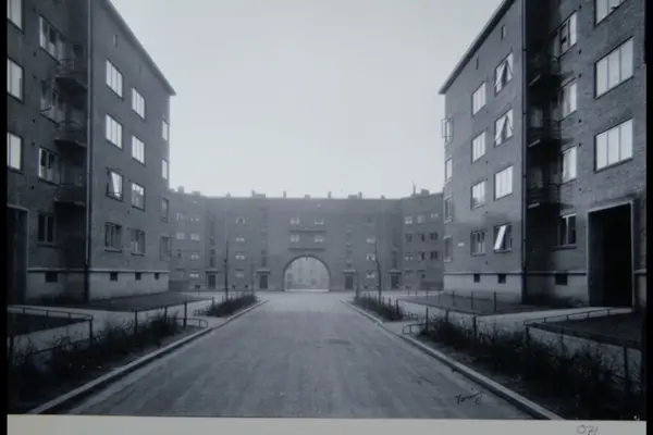 Husfasader mot Edvard Griegs alle foran og Nordkappgata bak. Portal / Buegang mot Sæveruds plass. Fra Søndre Åsen-kvartalene. Sannsynligvis fra 1920-tallet. Albumtittel: "Fotografier over Kristiania kommunes boligbebyggelse II".