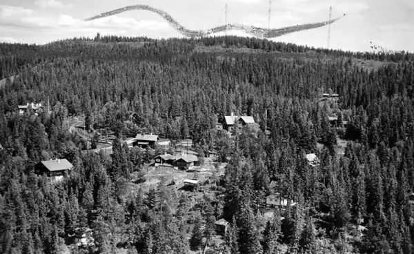 Lillevannsveien 88 - Vaumunds villa, Lillevann stasjon, Holmenkollbanen. Vaumunds villa midt i bildet. Ytterst til venstre synes Trollvasshytta (Rødkleivfaret 1). Også Renbergs villa (arkitekt Augen Nilsen) er tydelig i venstre del av bildet, og Falkenbergs hus er tydelig litt til høyre for bildets midtpunkt. Ellers skimtes også til høyre Lillevannsbråten (Kvinnelige Handelsstands Forening) og ovenfor dette huset til Ola Sandvik. På åsryggen ses Tryvannsmastene, men også det gamle Tryvannstårnet i tømmer til venstre. (Flyfoto)