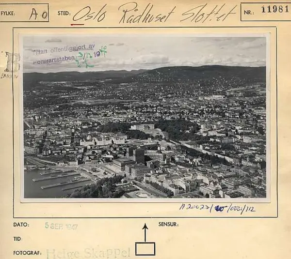 Korrekt referanse til dette bildet er "Fotograf: Widerøes Flyveselskap / Helge Skappel. Oslo byarkiv/A-20027/Ua/0015/112"