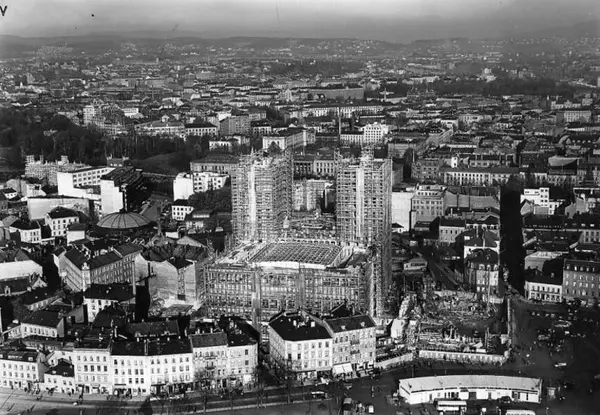 Bygging av Rådhuset, den gamle bebyggelsen i Pipervika måtte etter hvert gi plass til den nye Rådhusplassen, Sjøgaten, Rosenkrantz' gate. Bildet er tatt 4. november 1935 (Flyfoto)