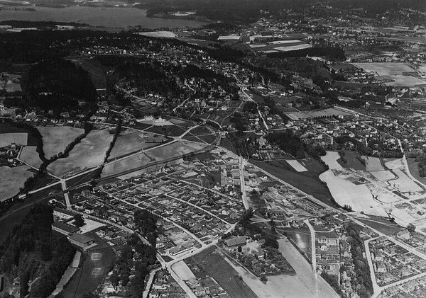 Store Ringvei (Kaj Munks vei), Tåsenveien, Nordbergveien, Nils Lauritssøns vei, John Colletts alle, Humleveien, Kløverveien, Irisveien, Syrenveien, Carl Grøndahls vei, Godals vei, Løvåsveien, Pastor Fangens vei. Hauges vei. Sognsvannsbanen. Bakkehaugen gård. Nordre Tåsen gård. Berg videregående skole. Tåsen skole. Nydalen. Grefsen i bakgrunnen. Bildet er sannsynligvis tatt i 1930- årene. (Flyfoto)