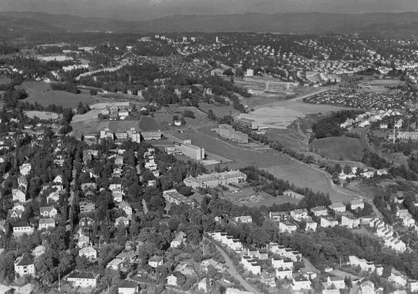 Store Ringvei (Torgny Segerstedts vei), Rasmus Winderens vei (tidl. en del av Blindernveien), Ivar Aasens vei, Aasmund Vinjes vei, Forskningsveien, Haakon den godes vei, Anne Maries vei, Gaustadalleen, Damkroken, Vindernveien. Diakonhjemmets sykehus (Psykiatrisk avd. og Psykiatrisk poliklinikk, Vinderen). Sentralinstituttet for Industriell Forskning (senere Senter for industriforskning - SI -, nå SINTEF). Nåværende PFI-bygget (Papirindustriens forskningsinsitutt). Norsk Regnesentral. Meteorologisk institutt. Vestre Gaustad gård. Gaustad sykehus. Sogn Hagekoloni og Ullevål Stadion i bakgrunnen. (Flyfoto)