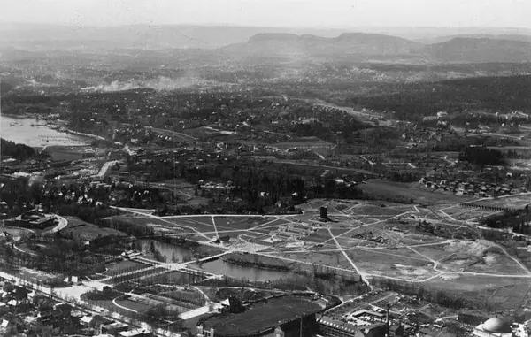 Kirkeveien. Frognerparken. Vigelandsparken. Monolitten under oppførelse? Nordjordet. Vigeland-museet. Frogner hovedgård. Frognerdammene. Frogner stadion. Colosseum kino. Hoff, Skøyen og Bestumkilen nærmest i bakgrunnen. Bildet er tatt mellom 1930 og 1936. (Flyfoto)