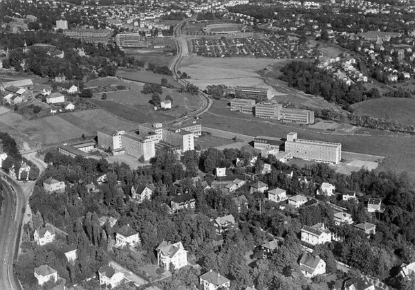 Store Ringvei (Torgny Segerstedts vei), Slemdalsveien, Haakon den godes vei, Ivar Aasens vei, Aasmund Vinjes vei, Forskningsveien. Sentralinstituttet for Industriell Forskning (senere Senter for industriforskning - SI -, nå SINTEF). Nåværende PFI-bygget (Papirindustriens forskningsinstitutt). Norsk Regnesentral. Vestre Gaustad gård. Gaustad sykehus, Sogn videregående skole (tidl. Sogn Yrkesskole), Sogn Hagekoloni og Ullevål Stadion i bakgrunnen. (Flyfoto)