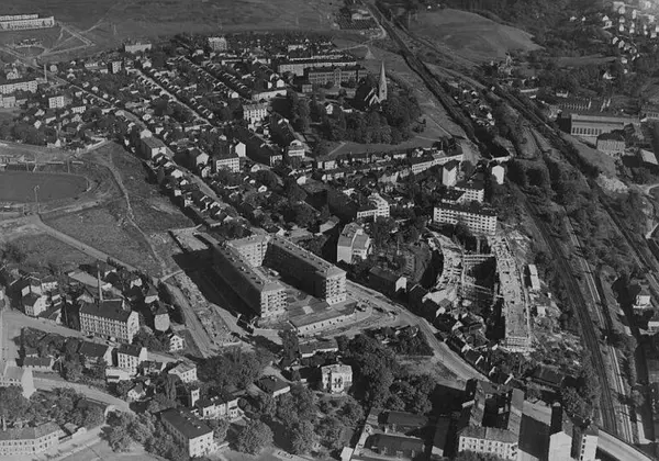 Strømsveien, St. Halvards gate, Åkebergveien, Jordalsgata, Normannsgata, Brinken, Enebakkveien, Vålerenggata, Danmarks gate. Galgeberg borettslag (første kooperative boligkompleks i OBOS, fra 1936). Jordal idrettsplass. Vålerenga kirke. Blokker til Dalehaugen under oppførelse. Etterstadsletta 4 ("Etterstadslottet" fra 1931) i bakgrunnen. (Flyfoto)