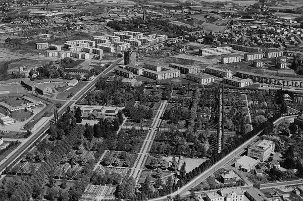 Strømsveien, Tvetenveien, Østensjøveien, Store Ringvei (Hjalmar Brantings vei), Karl Staaffs vei. Østre gravlund med Kapellet og Østre krematorium. Hovin skole. Helsfyr hotell. Gullhaug gård. Teisen nærmest i bakgrunnen. Ulven gård og transformatorstasjon, Østre Aker kirke og Fjellhaug bakerst. Blokker. (Flyfoto)