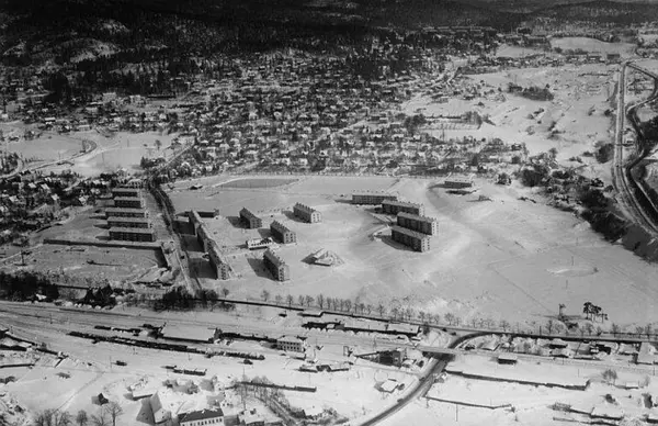 Store Ringvei (Storoveien), Hans Nielsen Hauges gate, Kjelsåsveien, Grefsenveien, Åsensvingen, Kapellveien, Lettvintveien, Lofthusveien, Trondheimsveien. Nordre Åsen. Grefsen stasjon på Gjøvikbanen. Grefsen vognhall of verksted under oppførelse. Nordre Åsen idrettsanlegg (Skeidbanen). Muselunden. Haraldsheim vandrerhjem. Disen i bakgrunnen. (Vinter) (Flyfoto)