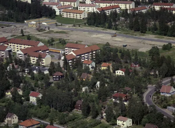 Cecilie Thoresens vei bak. Østerliveien (blokker) i bakgrunnen. Radarveien (blokker) foran Cec. Thoresens vei. Lambertseter senter, bensinstasjonen og industribygg ligger i dag på den ubebygde plassen. Lambertseterveien foran til høyre. (Flyfoto)