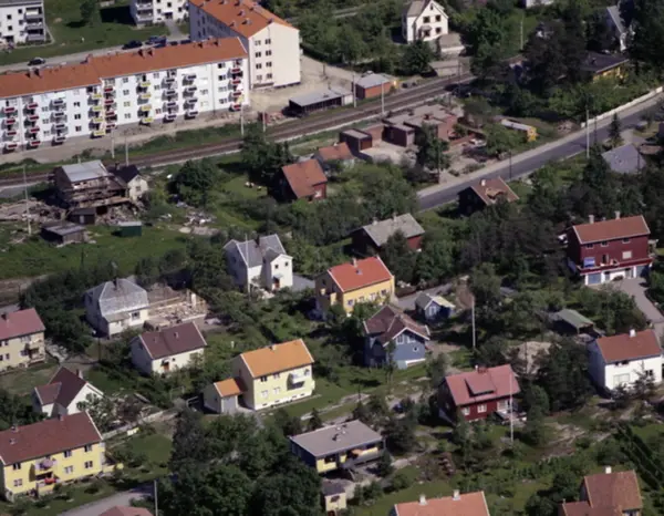 Villabebyggelse i Steingrims vei. Blokker i Frøydis vei. Lambertseterbanen (t-bane) parallelt med Steingrims vei. Hus med stillas ble flyttet til side da t-banen ble anlagt.(Flyfoto)