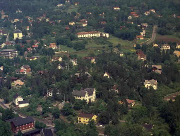 Villabebyggelse. Lilleaker skole, Ullern aldershjem, gamlehjem, sykehjem. Lilleakerveien, Haråsveien. Den røde bygningen foran til venstre er Lilleakerveien 16,tidligere arbeiderboliger for Mustad fabrikker. (Flyfoto)