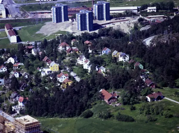 Ryen gård foran til høyre. Villabebyggelsen på Ryenberget. Til venstre pågår byggingen av Luxobygget. I bakgrunnen boligblokker på Etterstad. (Flyfoto)