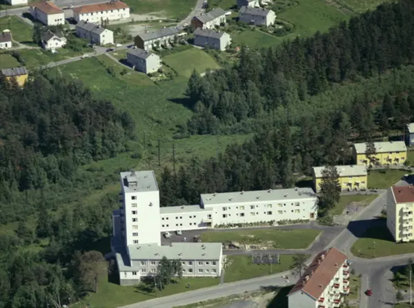 Lambertseter sykehjem. Feltspatveien kommer inn nede fra venstre, Marmorveien tar av til venstre og Nylænde til høyre. Langerudsvingen i bakgrunnen. (Flyfoto)