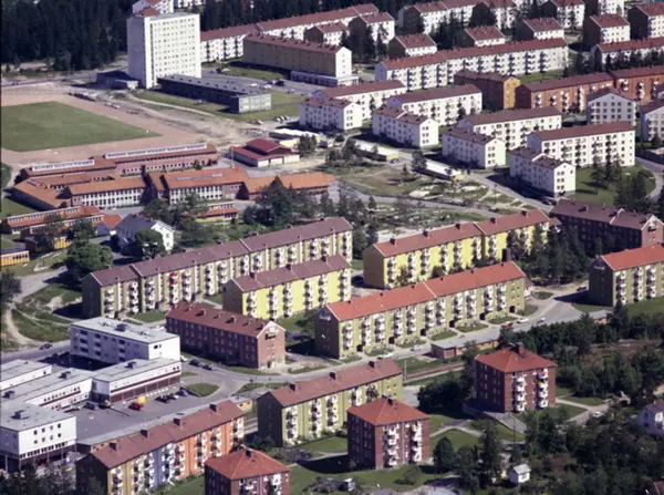 Skiferveien i front, til venstre Lambertseter senter ved Langbølgen. Lambertseter skole foran idrettsplassen. Bak til høyre boligblokker i Glimmersvingen og Glimmerveien. (Flyfoto)