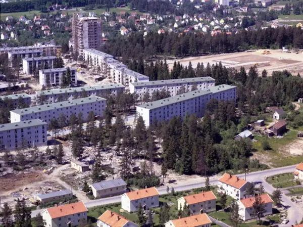 Hellerudveien nærmest, og Hellerudsvingen nede i høyre hjørne. Boligblokker i Vetlandsfaret, Vetlandsveien og Kranveien lenger bak. Villabebyggelsen på Godlia i bakgrunnen. (Flyfoto)