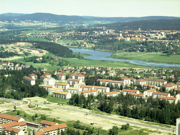 Cecilie Thoresens vei med boligblokker i Østerliveien, Gina Krogs vei. Boligblokker i Radarveien foran til venstre. Østensjøvannet i bakgrunnen. (Flyfoto)