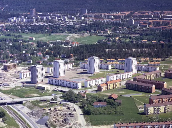 Søndre Manglerud gård i front, med Byggveien (til venstre) og Plogveien bak. Boligblokker i Rugveien. Ringveien og trikkeskinnene til Lambertseterbanen foran til venstre. Bebyggelsen på Oppsal helt i bakgrunnen. (Flyfoto)