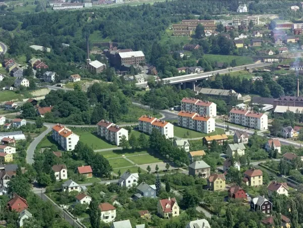 Maridalsveien til høyre, Bakkehaugveien til venstre. Villabebyggelsen i Blåsbortveien og Ustvedts vei nærmest. Ringveien over Nydalsbrua i bakgrunnen. (Flyfoto)