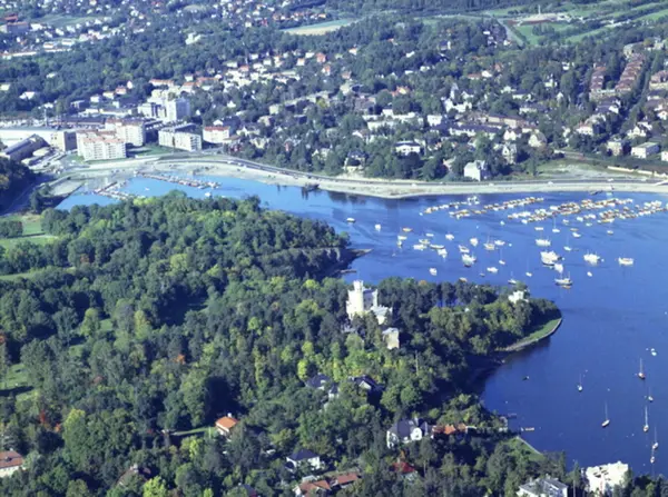 Frognerkilen med Oscarshall Lystslott midt på bildet. Villabebyggelse i Dronninghavnveien nærmest. Frognerstranda på bortsiden av Frognerkilen. Bebyggelsen ved Drammensveien og Bygdøy Allé lenger bak. (Flyfoto)