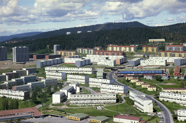 Veitvet skole i front. Veitvetveien til høyre. Boligblokker i Beverveien, Veitvetstubben og Hubroveien. Boligblokker ved Trondheimsveien i bakgrunnen. (Flyfoto)