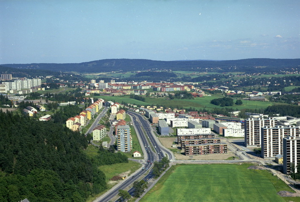 Trondheimsveien krysses av Erich Mogensøns vei i front. Sletteløkka går parallelt med Trondheimsveien til venstre. Bebyggelsen på Bredtvet og Kalbakken i bakgrunnen. (Flyfoto)