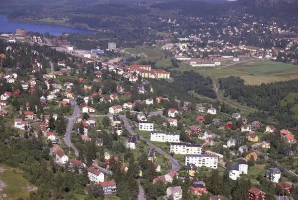 Tåsenveien og Heierstuveien krysser Carl Kjelsens vei. Jernbanesporet til Gjøvikbanen til høyre. Maridalsvannet og bebyggelsen på Kjelsås i bakgrunnen. (Flyfoto)
