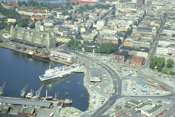 "Holger Danske" ligger til kai i Bjørvika, her ligger i dag Operaen. Hovedveien gjennom Oslo, som her er Havnegata, passerer Bjørvika og fortsetter opp Rådhusgata. Havnelageret til venstre. (Flyfoto)