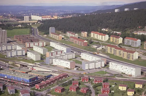 Veitvet senter og Grevlingveien i front til venstre, med T-banesporet til Grorudbanen bak. Trondheimsveien og Slettløkka går parallelt lenger bak i bildet. (Flyfoto)
