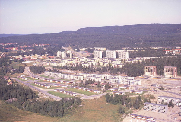 Rekkehus i Bogerudveien og Bogerudslyngen. General Ruges vei går bak rekkehusene. Stallerudveien ved høyblokkene til høyre. Bøler i bakgrunnen. (Flyfoto)