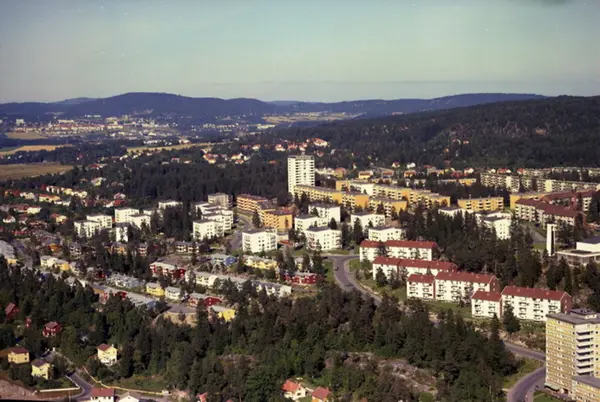 Rekkehus i Sveiserveien, Klinkerveien og Solbergliveien. Skøyenåsveien til høyre. Boligblokker i Mekanikerveien, Filerveien og Kranveien lenger bak. Oppsal kirke til høyre. (Flyfoto)